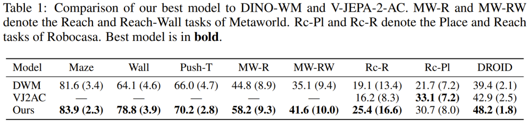 在与 DINO-WM 和 V-JEPA-2-AC 的直接较量中,该模型在几乎所有维度上均取得了领先。