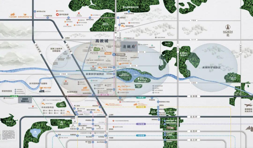 昌平线:距沙河高教园站约1.2KM;一轨联动产业聚集地,沙河高教园-生命科学园-永丰产业园-翠湖科技园-上地软件园-中关村学院路等。伴随着昌平线南延的全线贯通,昌平线与 12 号线实现换乘,使海昌两区无缝衔接,并将昌平线与中关村、学院路、望京、东坝等重点功能区快速串联。