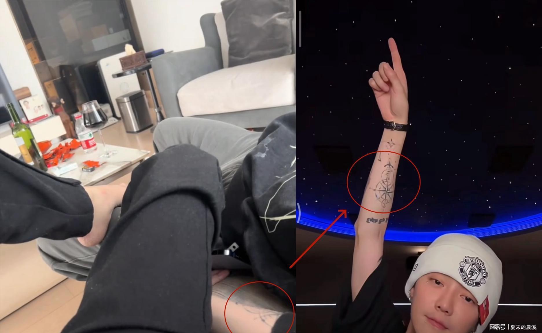 一双腿搭在男生腿上,纹身若隐若现,背景像极了鹿晗家的沙发和地板。