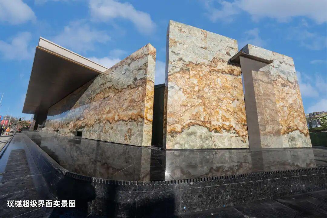 整体的尺寸是前提,单个模块的面积也一点不含糊,璞樾的超级展示界面,分为3个部分,其中主大门区域由北向南依次是:正反两面约400㎡的金光麻奢石墙面,正反两面约300㎡的乌金琉璃墙面,正反两面约750㎡的香格里拉奢石墙面。