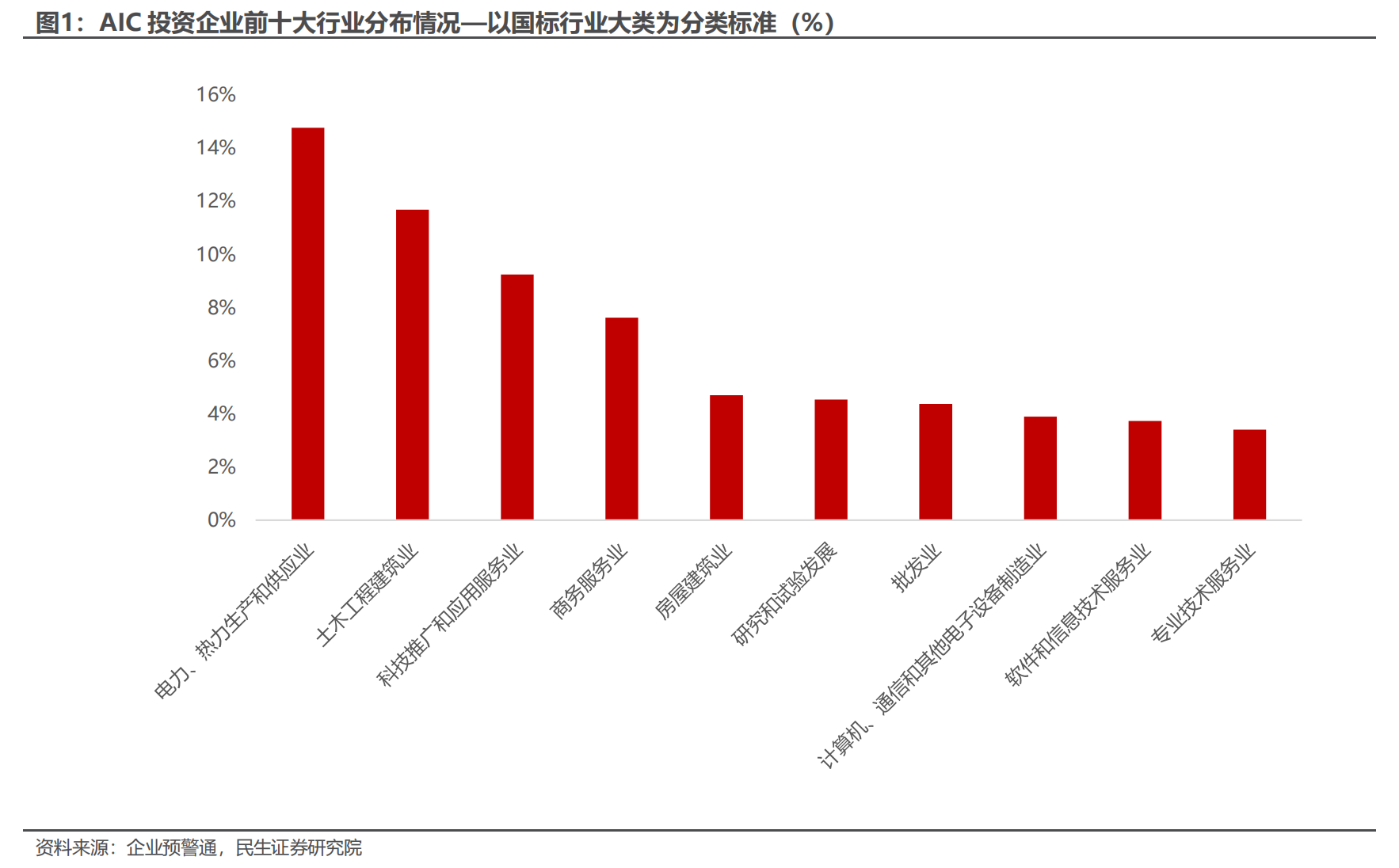 AIC 正逐步成为科技金融市场中重要的“耐心资本“。民生证券研究显示,截至2025年10月末,AIC 重点投资的领域聚焦在电力、热力生产和供应业、土木工程建筑业、科技推广和应用服务业等行业。在战略性新兴产业方面,可以看到 AIC 投资的企业主要集中在新能源产业、新一代信息技术产业、高端装备制造产业等。同时持股比例八成落在50%以内,近四成低于5%,形成“分散布局+重点深耕”的银行系“耐心资本”新范式。