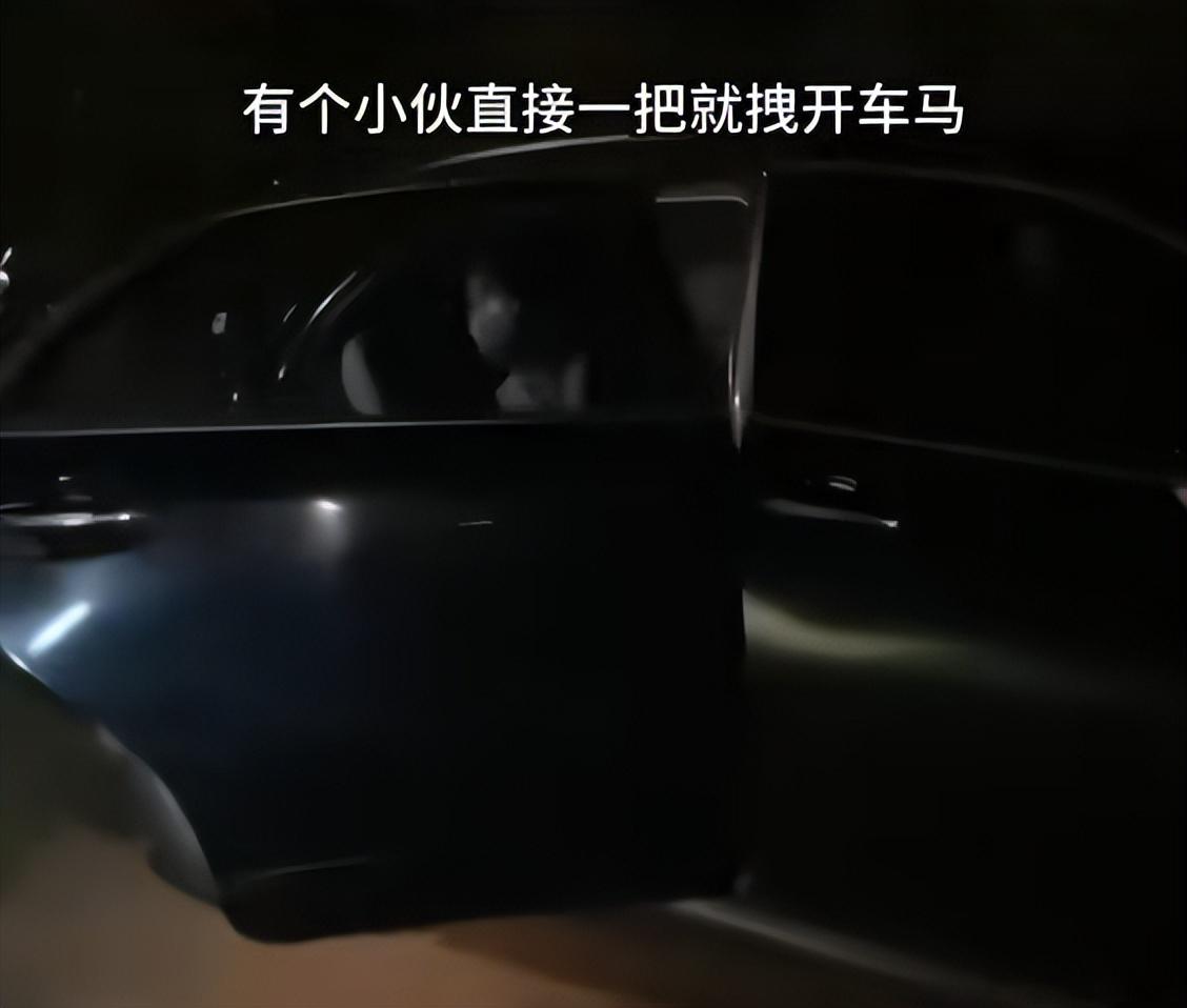 不知道是忘了锁车还是故意为之,眼看车门打开,车内的女子一脸的慌乱,虽说已经把口罩带好避免了被人认出,可一看到外面这么多小伙子起哄拍照,女子只能先伸手准备把车门关上,防止被认出来。