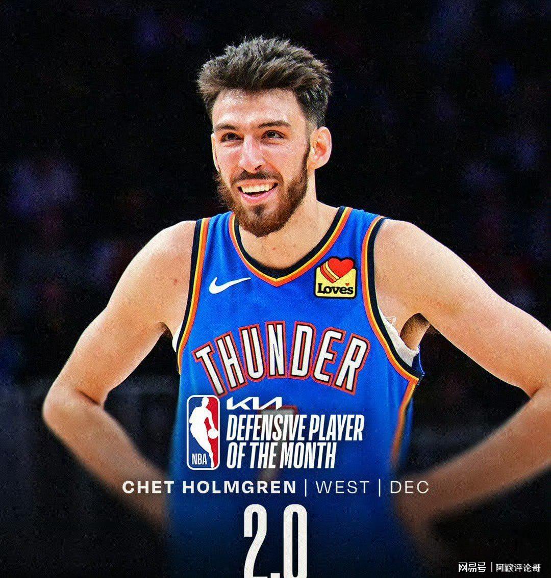 雷霆队的切特·霍姆格伦当选西部月最佳防守球员,他场均送出2.0次盖帽,在他上场时雷霆每百回合防守失分仅为101.7分。