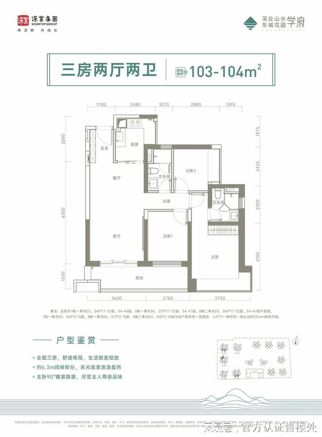103-104㎡的3房2厅2卫,设计的是经典竖厅格局,进门入户玄关,客厅3.6米开间,LDKB一体化设计,3个卧室,客厅连接次卧出6.3米的大阳台,U型厨房,卫生间干湿分离,西南、东南或西北朝向。