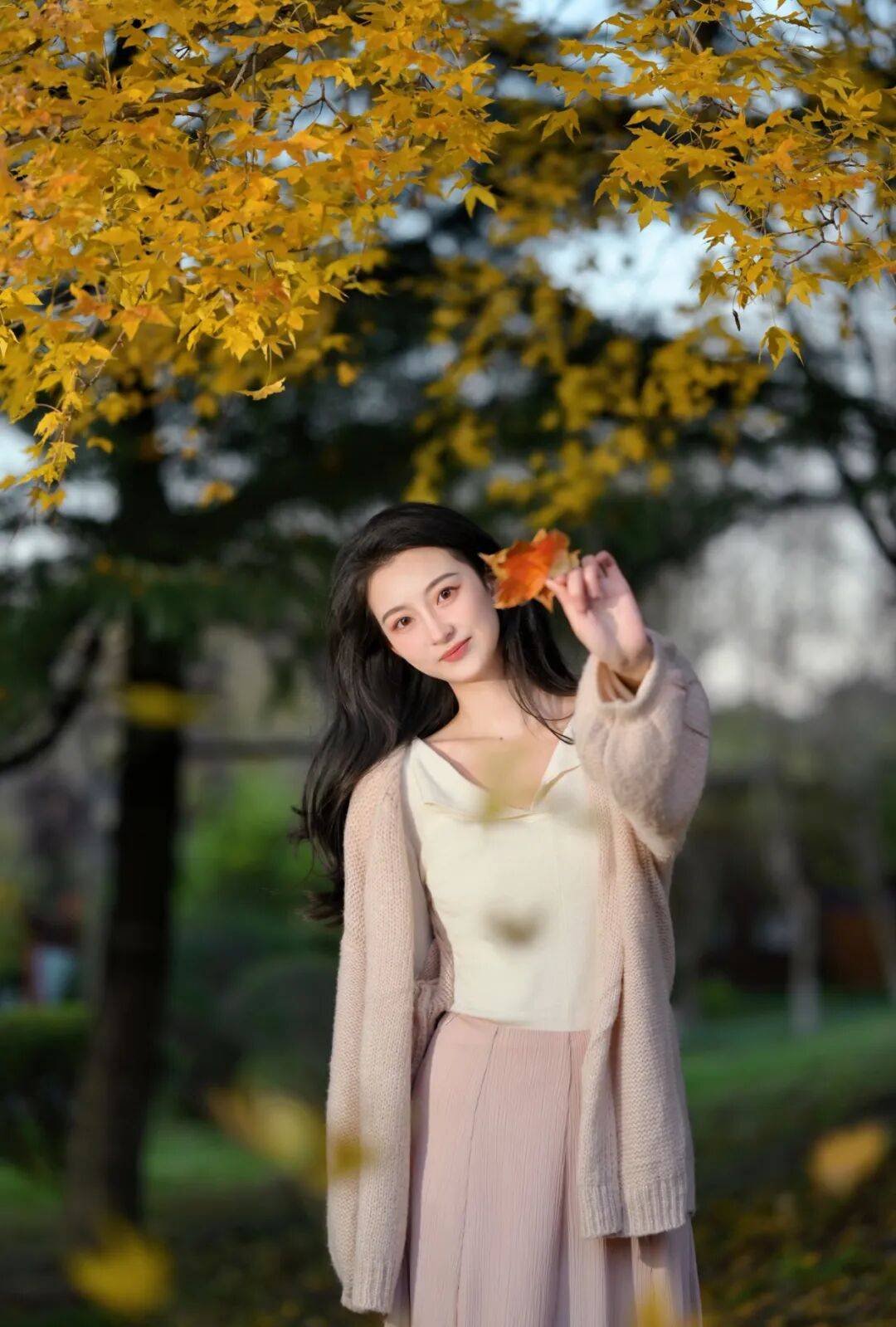 人物站在金黄的银杏树下,抬手轻举枫叶贴近脸颊,温柔的秋日氛围感瞬间拉满。略微仰拍的角度把满树黄叶和人物融合,画面更有层次感。浅杏色针织开衫搭配浅粉百褶裙,温柔又软糯,柔和的自然光衬得皮肤通透,枫叶做小道具,让秋日森系感更浓郁