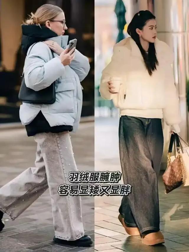 如果你选择一条黑色的紧身裤来搭配上蓬松感的羽绒服,那更头重脚轻了。就算你选择牛仔阔腿裤来搭配上臃肿的羽绒服,整个人就像企鹅一样,还会压个子。