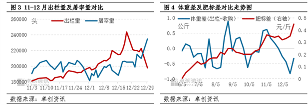 12月前期北方普遍降温,屠宰端宰量增幅明显,养殖端亦开启减重增量模式,出栏节奏加快。而西南、华南等地气温迟迟未降,腌腊始终不温不火,大猪看涨预期降低,养殖端开始加速出栏。而随着气温延迟下降,西南、皖南、苏南、两湖等地腌腊开始启动,河南、山东等地灌肠亦助阵需求增量,导致在月末呈现屠宰端持续增量而养殖端因出栏体重下滑、出栏减少的情况,剪刀差走势明显。