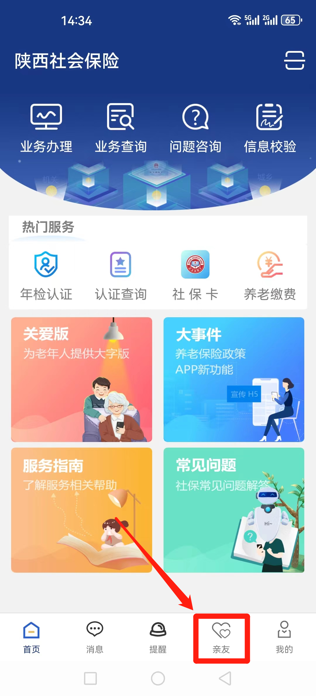 1、打开“陕西社会保险”APP,点击“亲友”