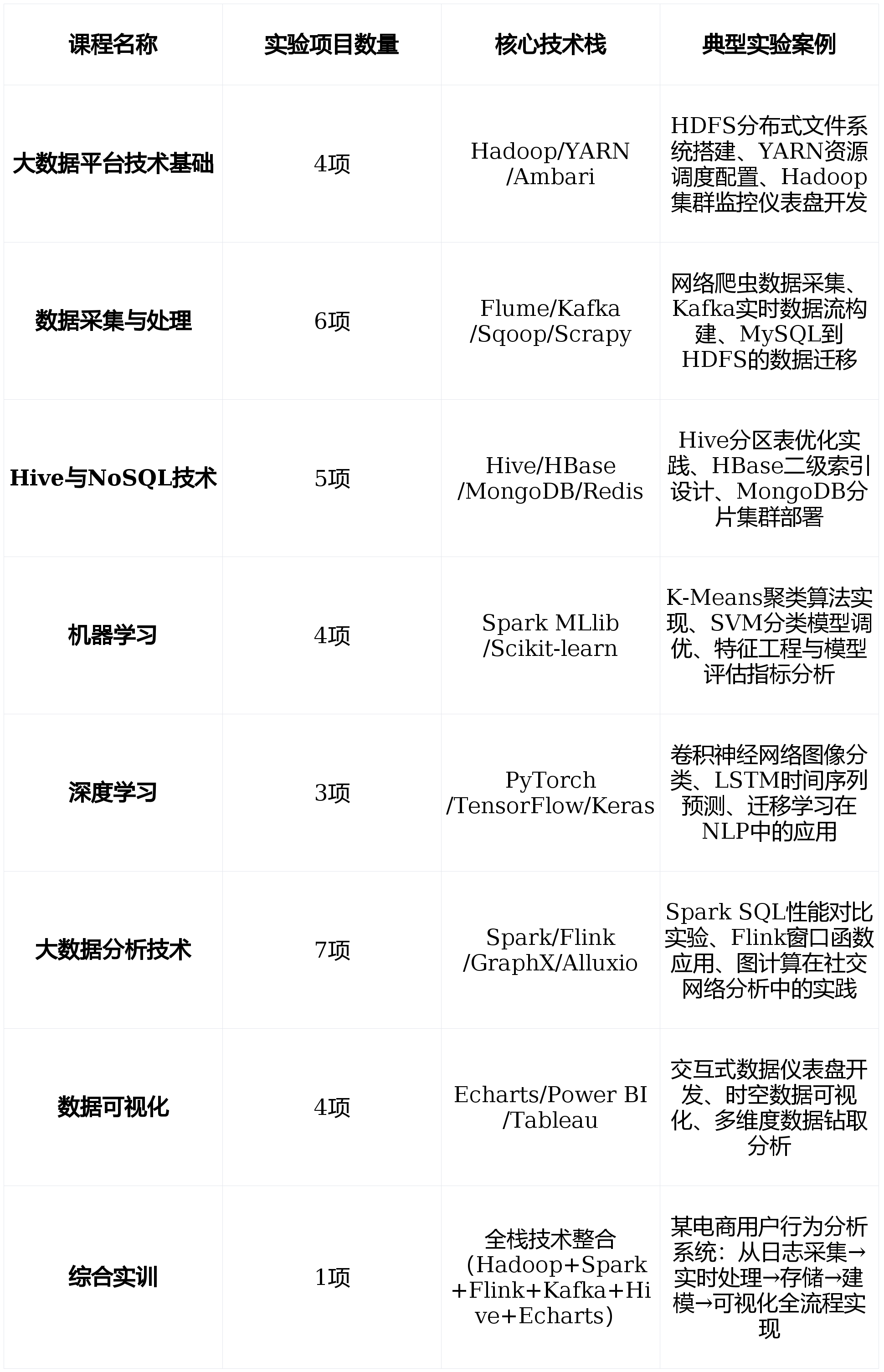 共设计42项实验项目,其中包含1项跨课程综合实训,覆盖大数据全技术栈