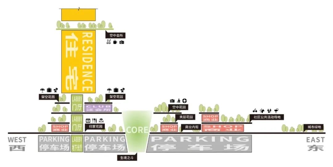 超高层项目常在底部设置简单底商,而本方案却创建了复合型立体底盘,整合商业与公园,通过步行系统实现连通。