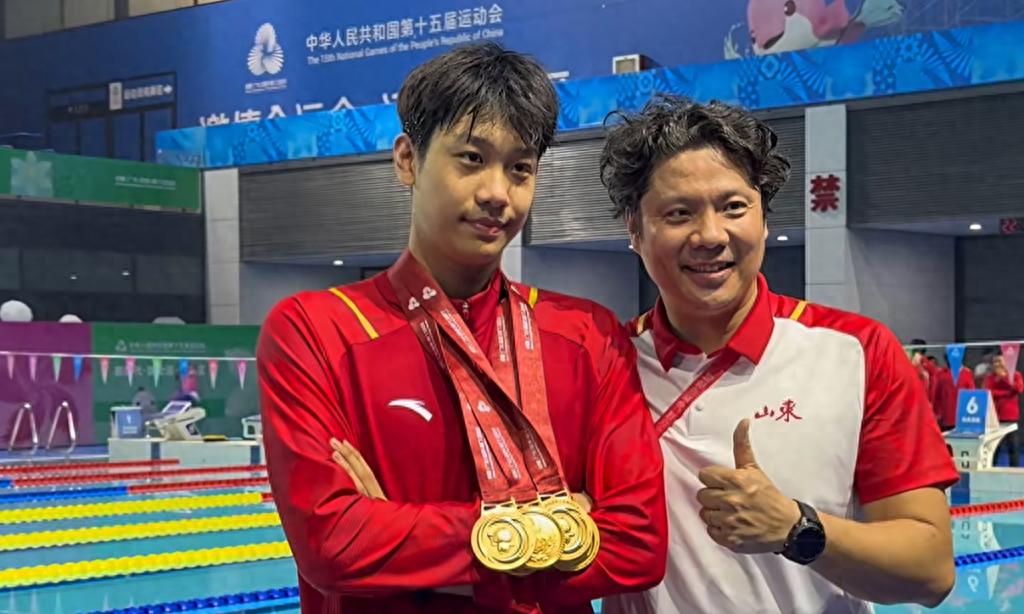 教练团队还为他量身设计了融合耐力、力量及心理抗压训练的“三维训练体系”。在2025大湾区全运会上,张展硕报名参赛7个项目。他先后获得200米、400米和800米自由泳三项个人冠军,以及一枚男子4×200米自由泳接力金牌。11月17日晚,他晋级1500米自由泳、400米个人混合泳两项单项决赛,其所在的山东队也获得了男子4×100米混合泳接力决赛资格。不到一小时内连续出战三场决赛几乎不可能,他的选择成为全场焦点。可能是受连续作战的疲劳影响,张展硕随后退出400米个人混合泳与4×100米混合泳接力的角逐,最终以5枚金牌的佳绩结束了本届全运会的征程。在全运会闭幕式上,张展硕也以优异的表现成为了山东代表团的旗手。