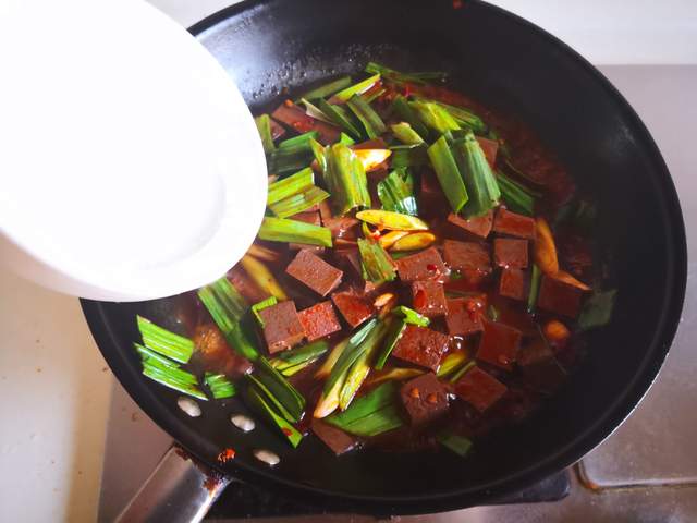 原料: 鸭血 1块 青蒜 2根 郫县豆瓣酱 1勺 油盐 少许