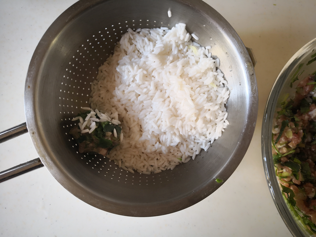 3. 提前将糯米洗净后用冷水浸泡一个小时, 沥干水分备用; 将准备好的香菜肉末馅团成肉丸,放入准备好的糯米中滚动,让香菜肉丸表面裹上一层糯米;