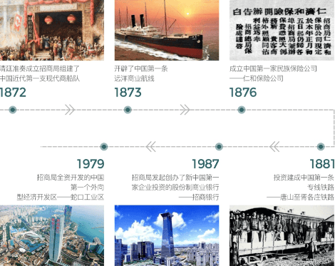 一家跨越了三个世纪的百年央企,成立于晚清同治十一年(公元1872年),由当时的北洋大臣、洋务运动领袖李鸿章上书清廷,奏准设立轮船招商局,至今已有152年历史。招商局诞生于中国近代“实业救国”的思潮下,是中国民族工商业的先驱,在中国近现代工商业发展历程中开创诸多第一。