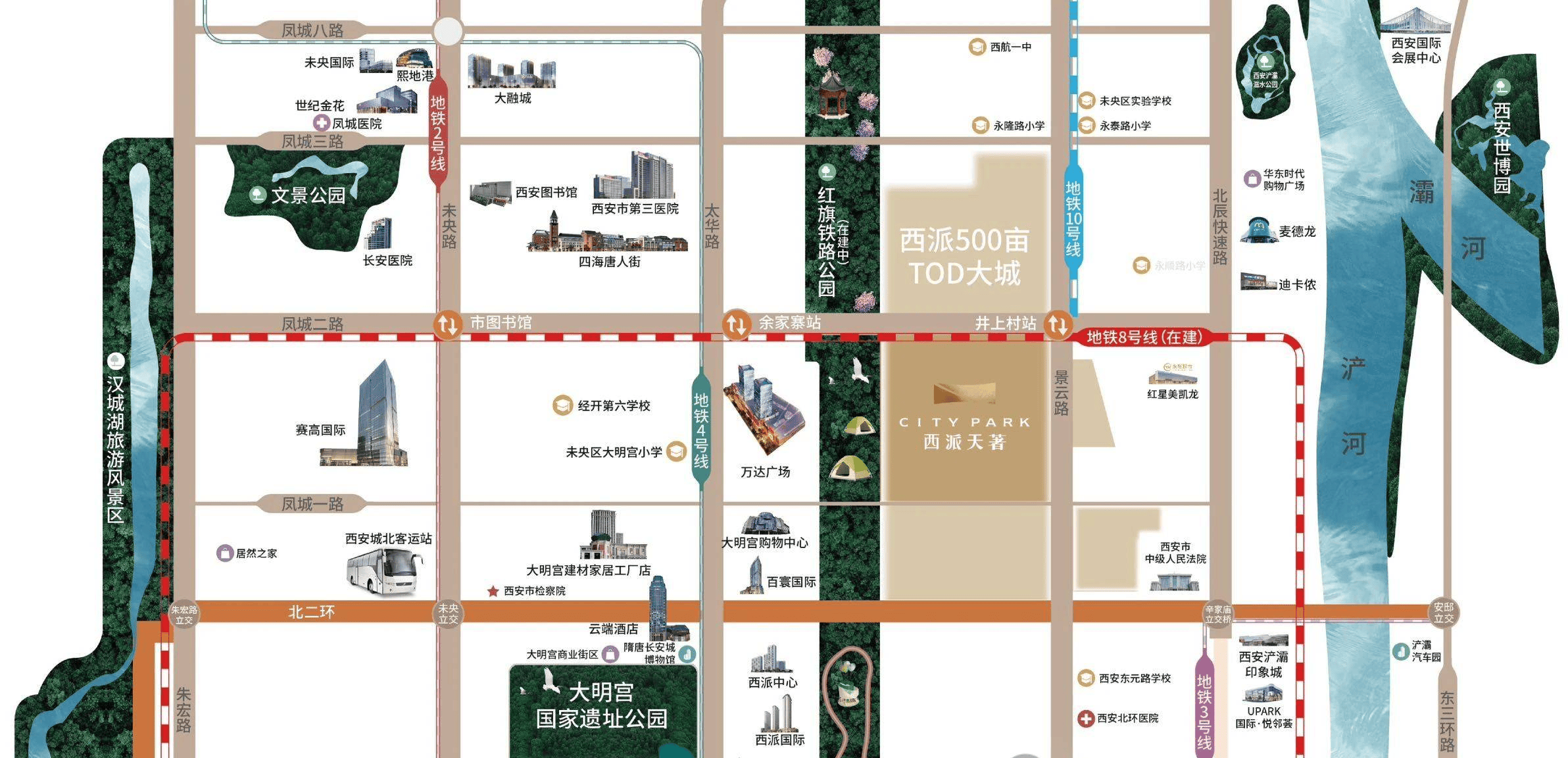 西派天著项目位于曲江大明宫遗址区范围红旗铁路以东, 凤城一路以北,凤城二路以南,经九路以西,项目总占地108.684亩。容积率2.8,绿化率35.175,建筑密度18.52%。