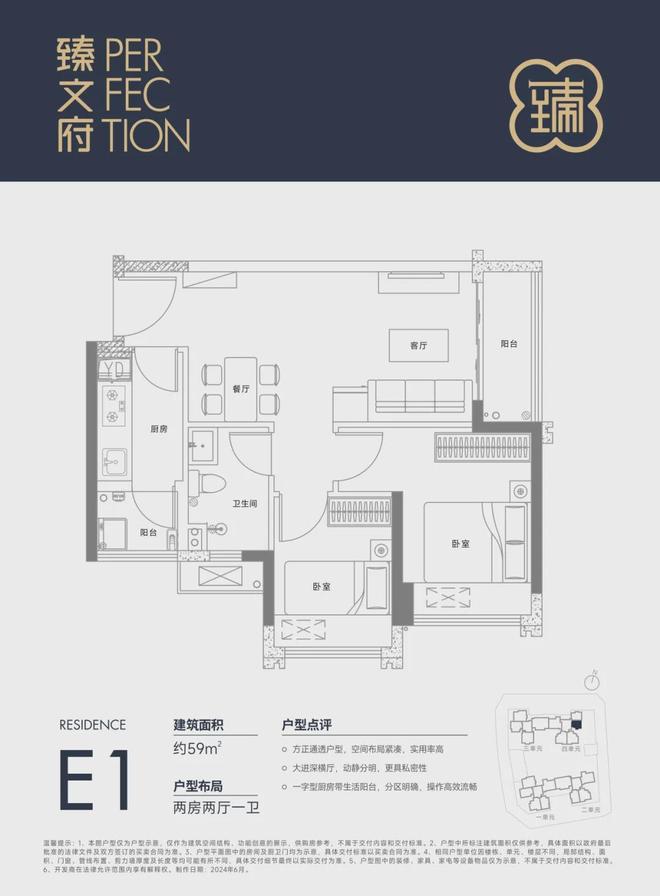 59㎡的2房2厅1卫,设计的是竖厅格局,客厅2.95米开间,超6米进深客厅,一字型厨房还带1个小生活阳台,卫生间干湿分离,得房率约85%(包含赠送),阳台朝东北向。