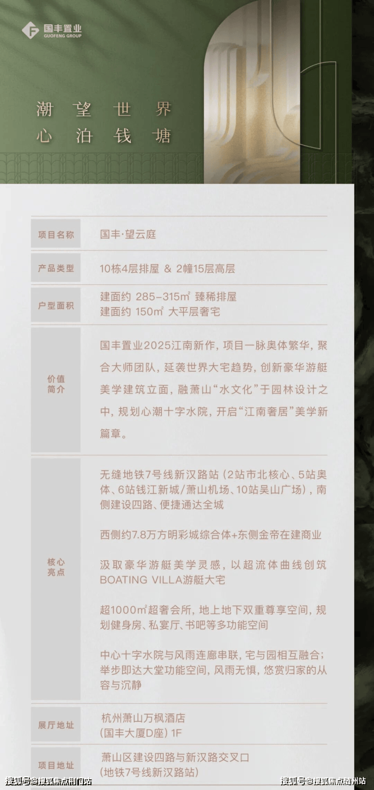 ▰▰ 萧山区 国丰·望云庭—火热销售中 ▰▰项目坐落于萧山区建设四路与新汉路交叉口,与地铁7号线新汉路站零距离接驳,总建筑面积约9.5万方,(约285-315㎡)(约150㎡大平层),以“BOATING VILLA游艇大宅”为定位,融合国际大师团队的设计智慧与国丰集团30年的精工底蕴,成为奥体板块400万级改善住宅中的佼佼者。售楼热线:☎ 400-8228-664「售楼处」☎〢已认证〢◆