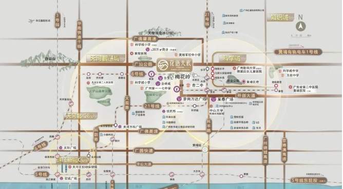 项目坐落于天河智慧城和黄埔科学城双城交汇之地,占据广州第三发展中轴线科技创新轴的黄金地段,发展潜力巨大。紧邻约 3 万方的梅花岭,仅约 20 米之距,是黄陂板块独一无二的全南向山景小区。小区内部精心打造约 3.1 万㎡循山森氧生态园林,为业主营造出静谧舒适的居住环境,清新空气相伴,每一次呼吸都是与自然的亲密接触,在繁华都市中享受难得的宁静与惬意。
