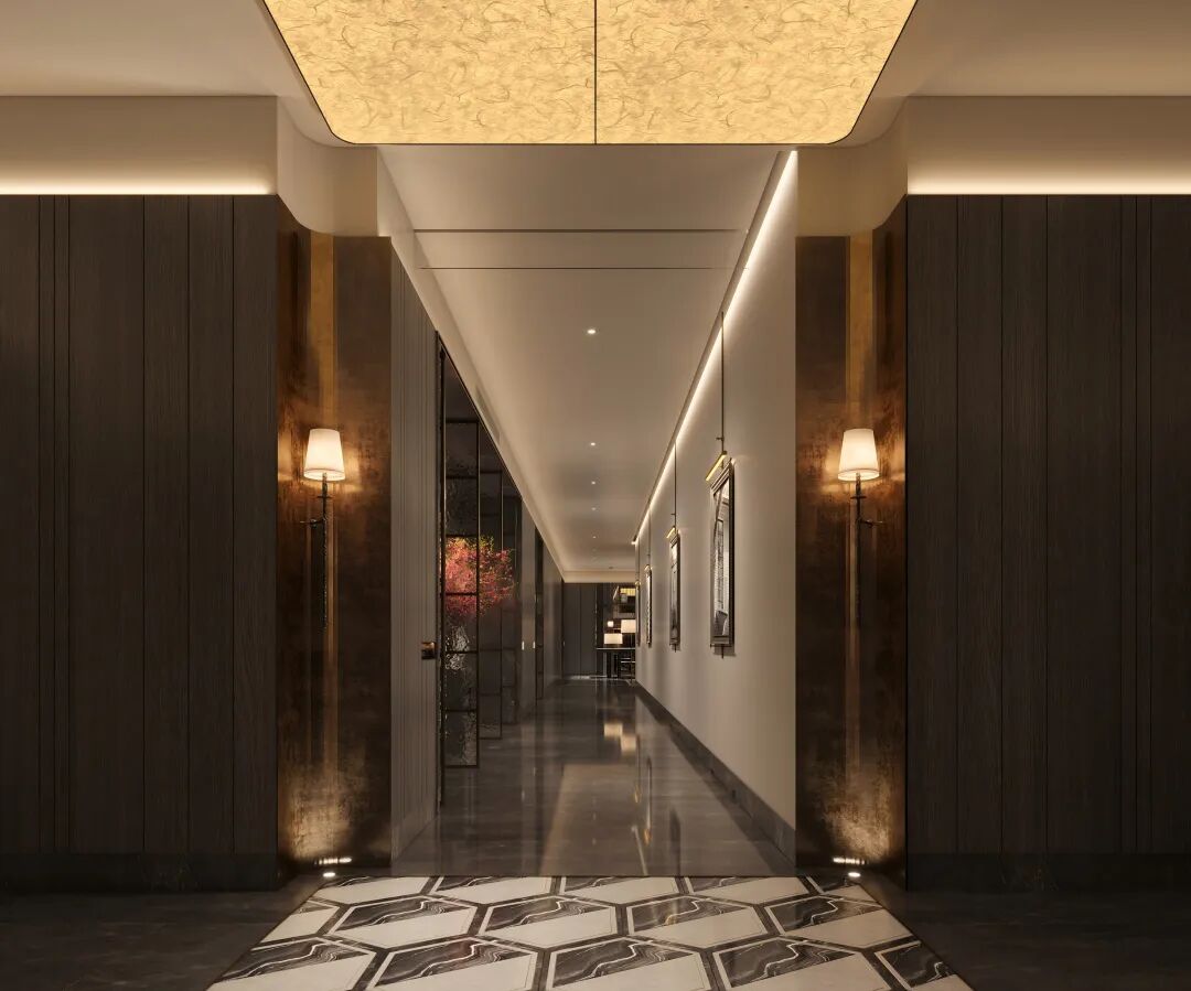 大堂空间的墙面采用了暖色调的奥特曼米黄石材,营造出温馨迎宾的氛围;地面则通铺着深邃大气的香格里拉黑大理石,彰显出入户的尊贵气度。