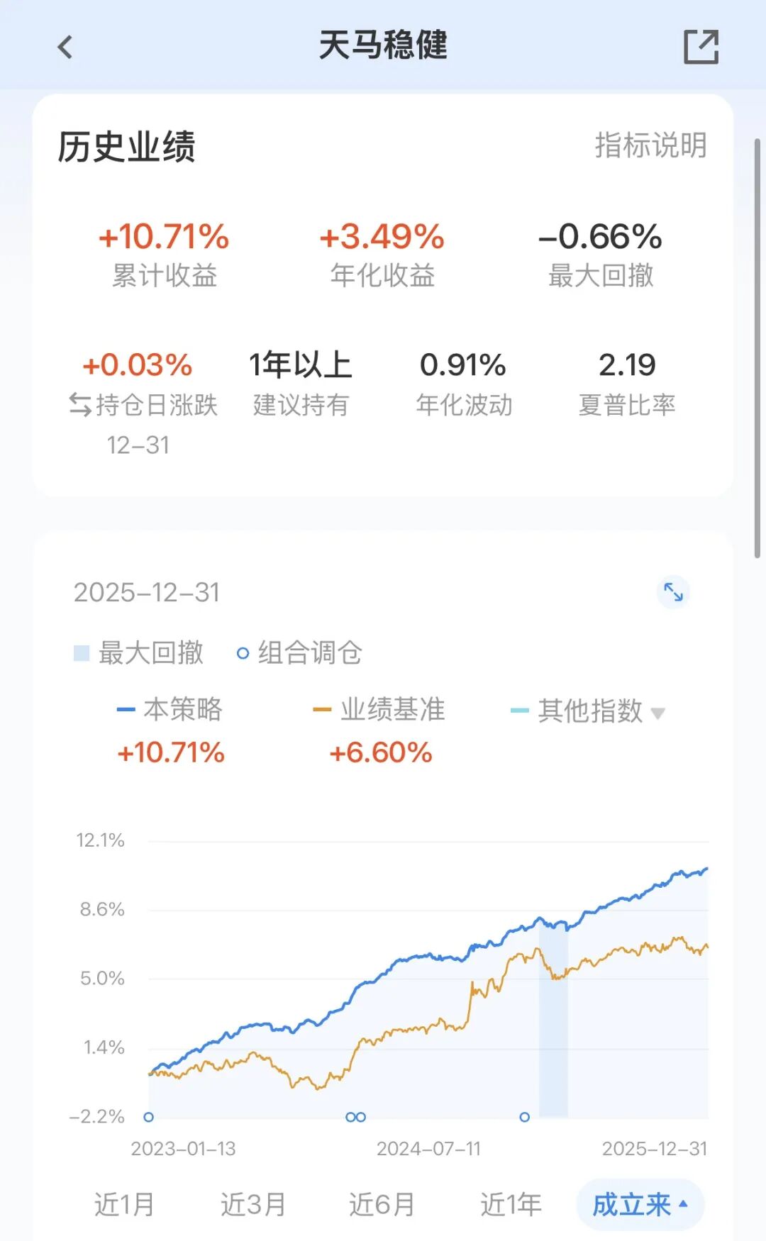 截止2025年12月31日,天马稳健组合累计收益率10.71%。