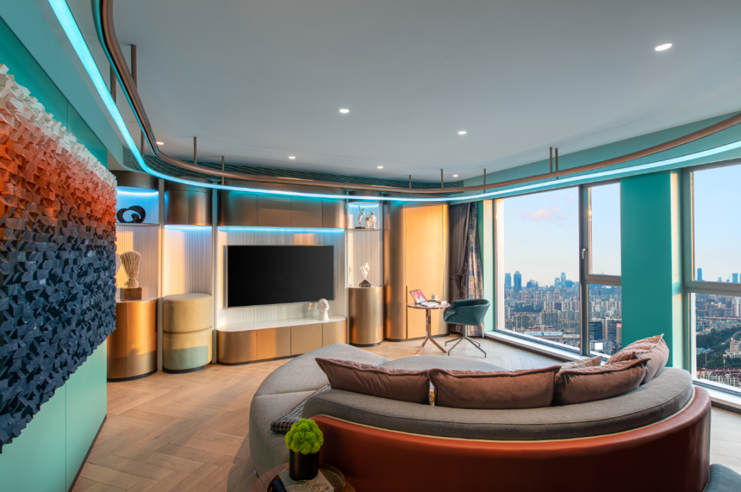 还有吧台、休闲洽谈区、共享会议和健身等功能区,是一个适合交友、会客、休憩、工作、读书、赏景的多功能空间.处处可见的时尚元素,符合当下年轻一代喜好。
