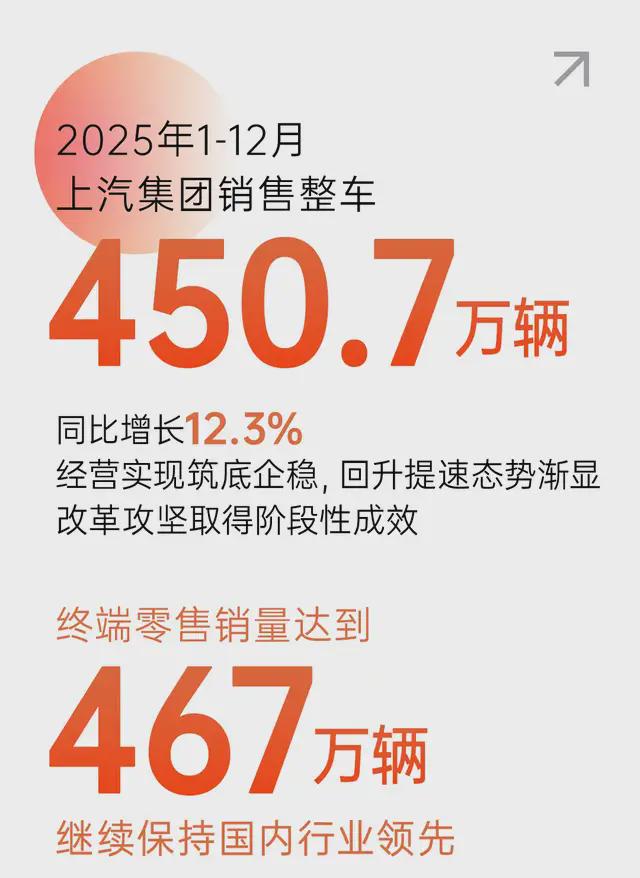 2025年,上汽集团以全面深化改革为抓手,重点聚焦自主品牌建设和智电技术突破,不断加快创新转型步伐,全年销售整车450.7万辆,同比增长12.3%,终端零售销量达到467万辆,继续保持国内行业领先,经营实现筑底企稳,回升提速态势渐显,改革攻坚取得阶段性成效。