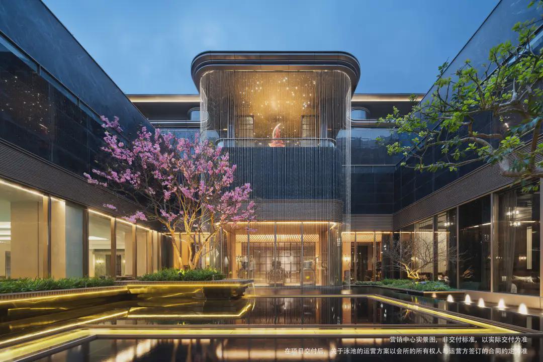 下沉式环幕庭院,跌水景观环绕,池底仿黑金砂与宝石晶片闪烁,点缀百余灯珠,师法“琉璃水光” 形意,糅合视听五感,打造全浸式立体园境,天工巧夺,嘉定未见。