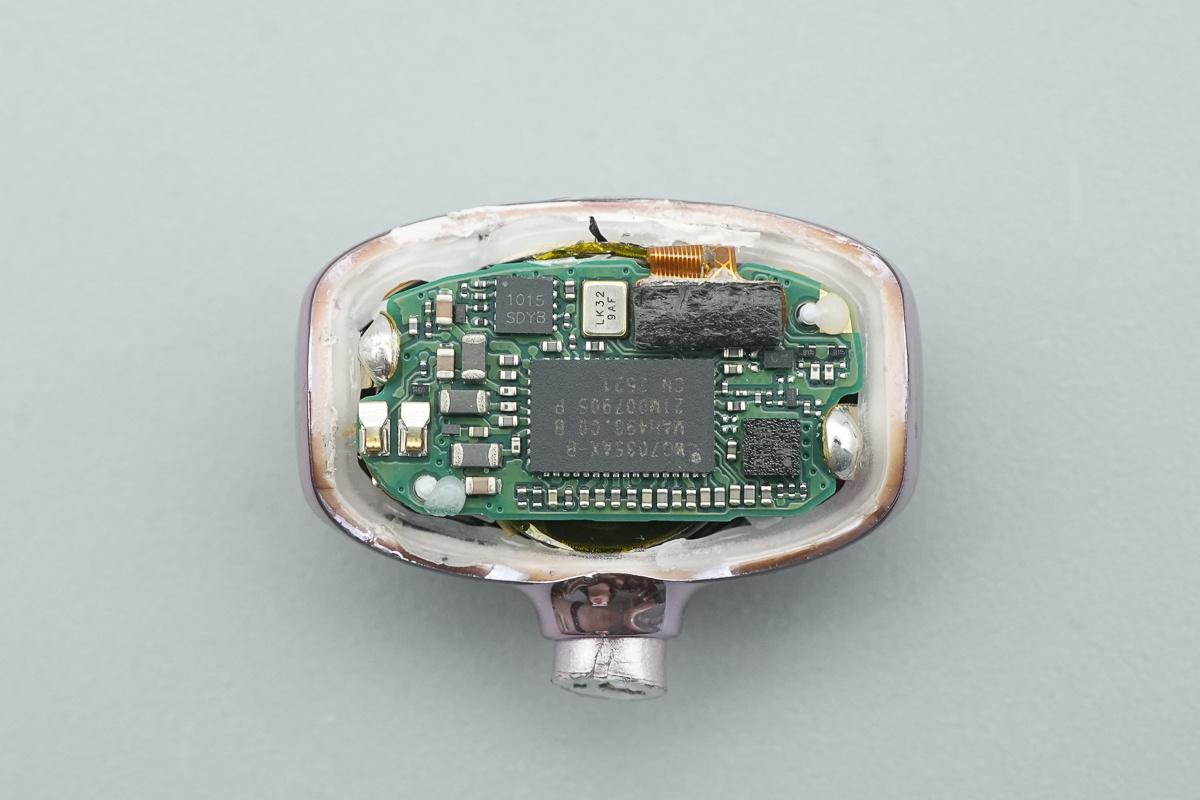 并使用昇生微SS88D8H电源管理芯片搭配创芯微CM1125-CAS电池保护芯片。耳机中使用物奇WQ7035AX-B蓝牙SOC芯片,搭配三颗麦克风。耳机内部通过排线和导线焊接连接,电池通过框架固定,内部设计扎实,做工可靠。
