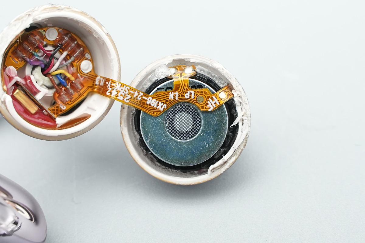 接下来拆解耳机,首先沿接缝拆开单元外壳,内部扬声器通过排线连接。