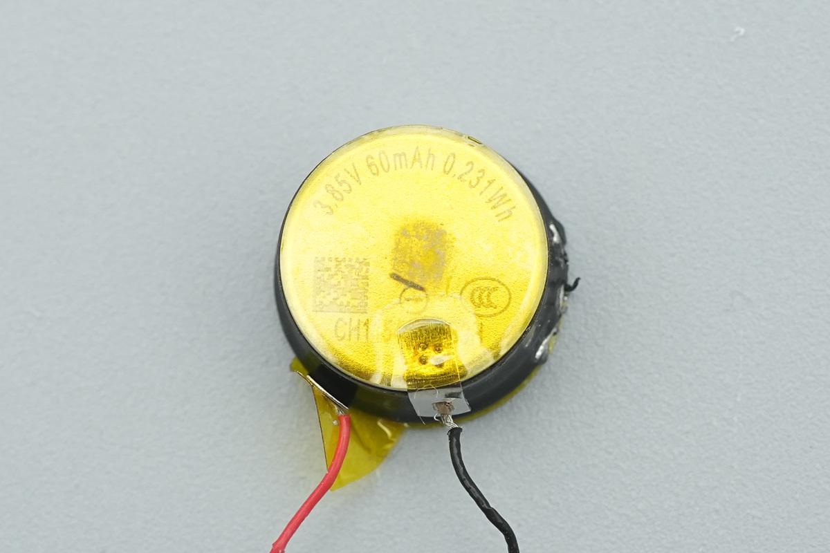 耳机内置钢壳扣式电池,通过塑封皮绝缘,电池负极点焊焊片,粘贴高温胶带绝缘。