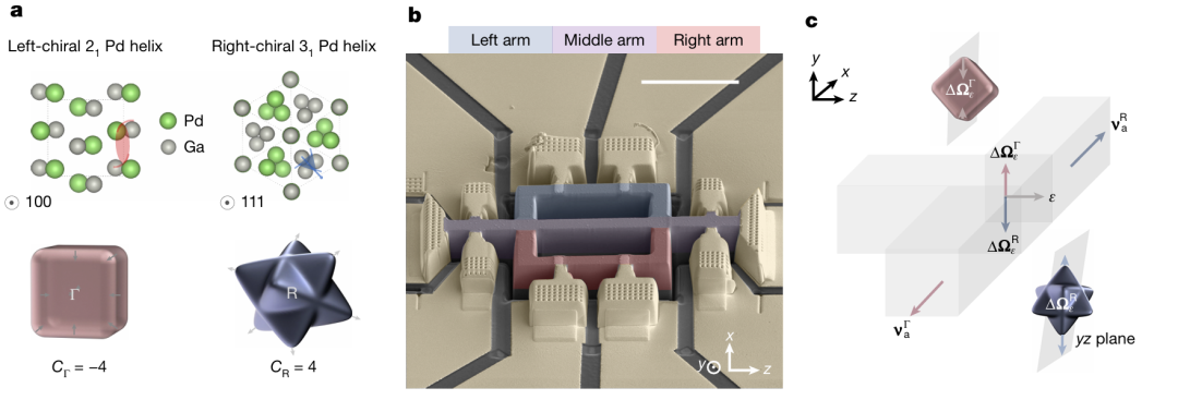 科普解读:这种特殊材料PdGa能像交通分流器一样,把不同“旋转方向”的电子分到不同路径。同时具有手性结构,电子在内部运动时,会表现出左右不同的“手性”。还设计了三叉形微器件,通过施加电流,利用电子波函数的量子几何性质,让左旋和右旋的电子自动分开,向左走和向右走,形成“手性电流”。这些分开的电子流还能像光波一样互相干涉,展现出量子特性。