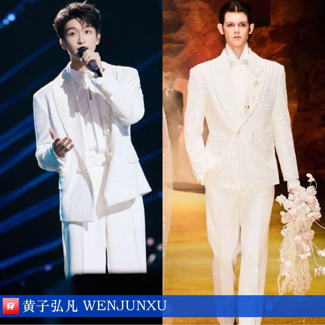 黄子弘凡,2025-2026江苏卫视跨年演唱会。白色珍珠闪钻西服套装:WENJUNXU。