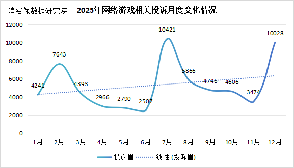 2025年,消费保平台共收到网络游戏相关投诉63681件,涉及金额4.24亿元,投诉解决率低,仅为6.62%,7月份与12月份投诉量出现激增,但整体投诉情况平稳。