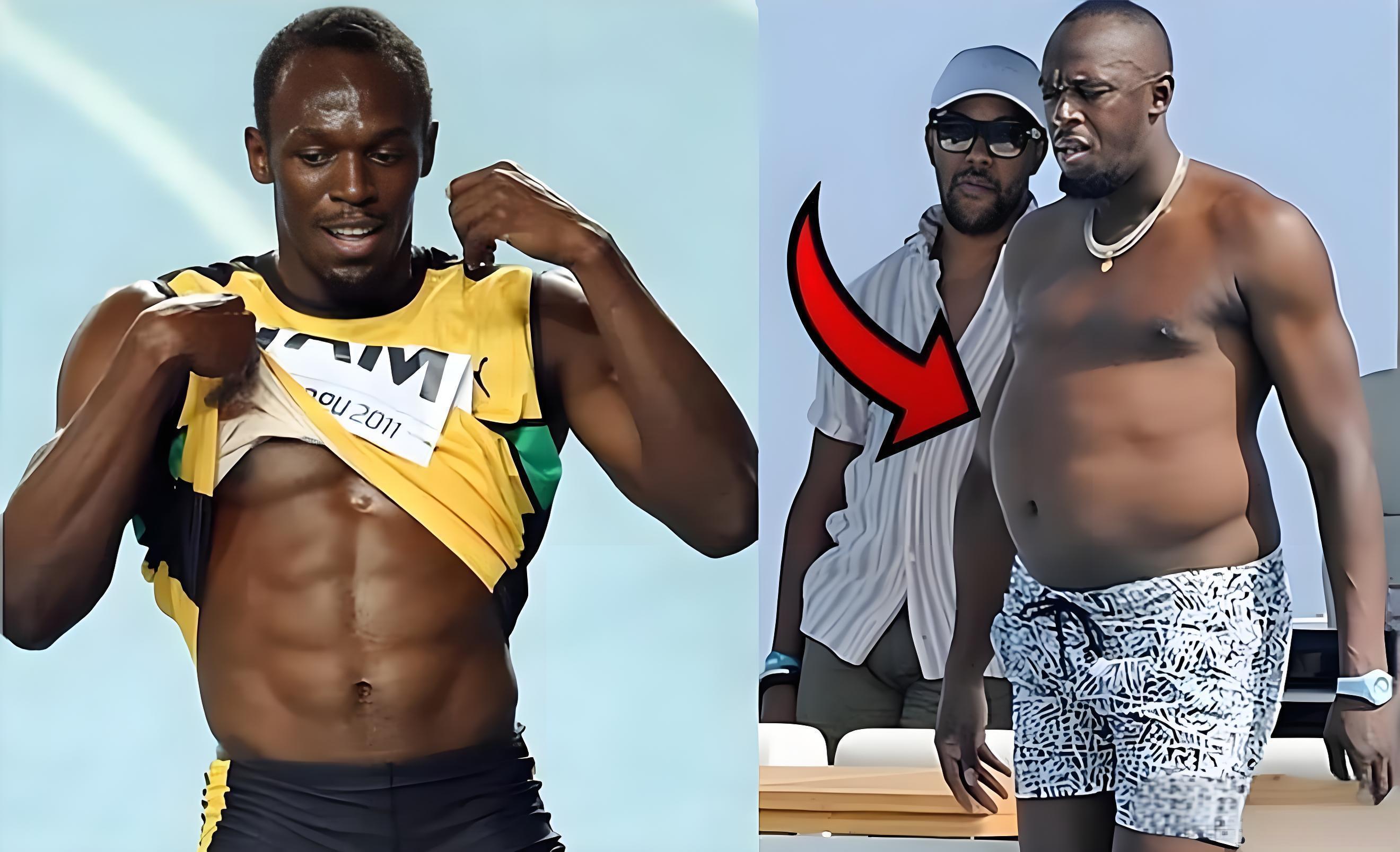 如今的博尔特,脸颊圆润,腰腹没了半分运动员的紧实,甚至都长出了肚腩,连胳膊上的肌肉都透着幸福肥。