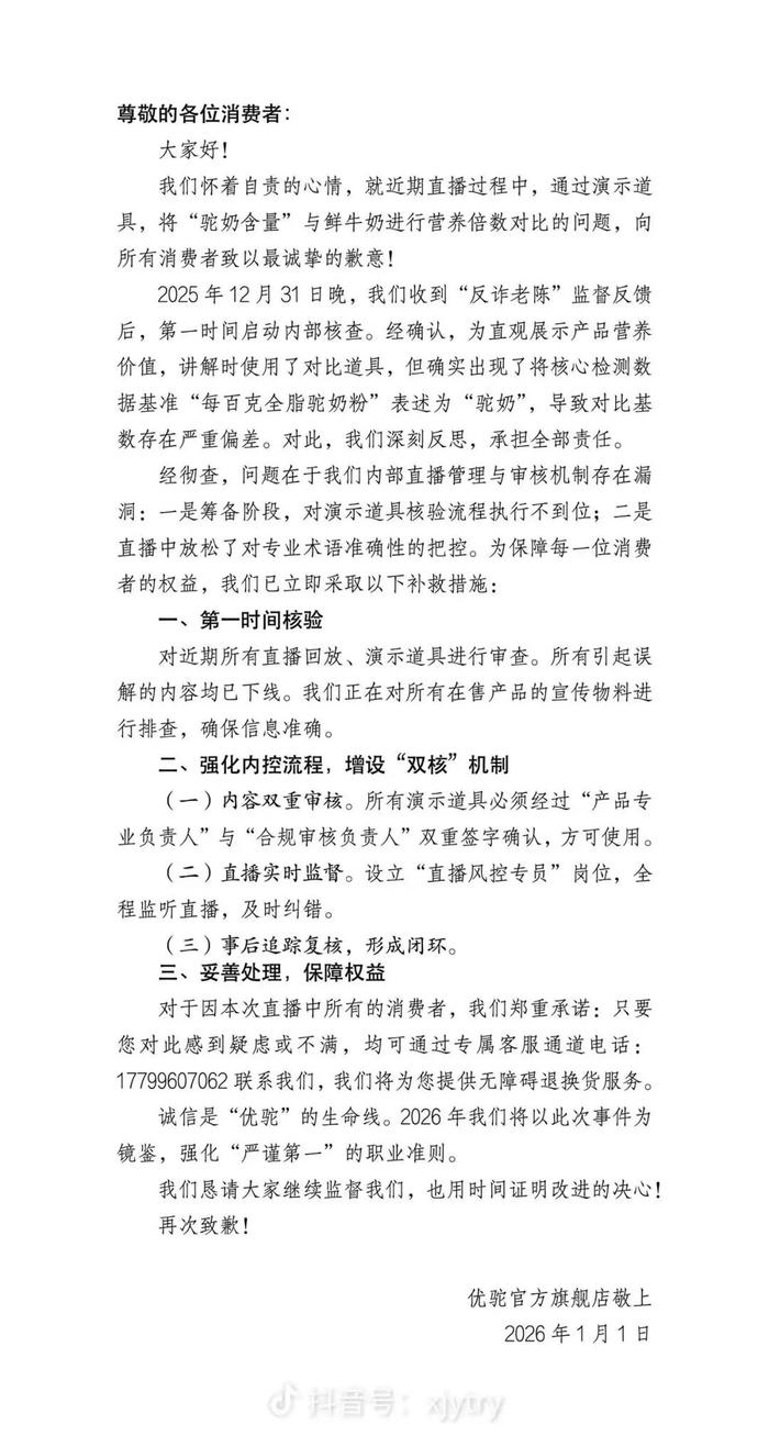 更关键的是,优驼官方自己都承认了问题:直播中拿“每百克全脂驼奶粉”的营养数据,直接跟液态鲜牛奶比,还说是“驼奶”含量高多少倍。这根本不是口误,而是典型的偷换概念。奶粉和鲜奶形态不同、浓度不同,硬要比营养密度,就像拿浓缩橙汁和矿泉水比维生素C含量——结果当然悬殊,但毫无意义。这种对比方式,目的不是科普,而是制造碾压感,诱导冲动消费。说白了,就是用看似科学的演示,干着误导消费者的勾当。