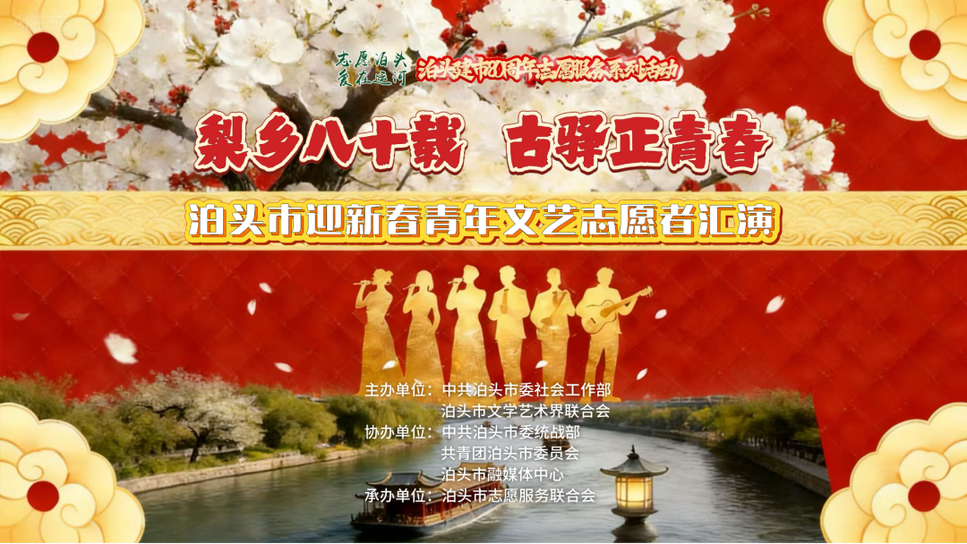 2026年,将迎来泊头建市80周年。为深化新时代志愿服务工作,以泊头建市八十载底蕴为根基,深挖古驿文化内核,汇聚全市青年文艺力量,搭建志愿展示平台,用多元文艺形式献礼新春,展现泊头青年朝气蓬勃、志愿奉献的精神风貌,丰富新兴领域从业者及老弱孤残群体新春文化生活,经研究,决定于春节前举办“梨乡八十载 古驿正青春”泊头市迎新春青年文艺志愿汇演活动。现将有关事项通知如下: