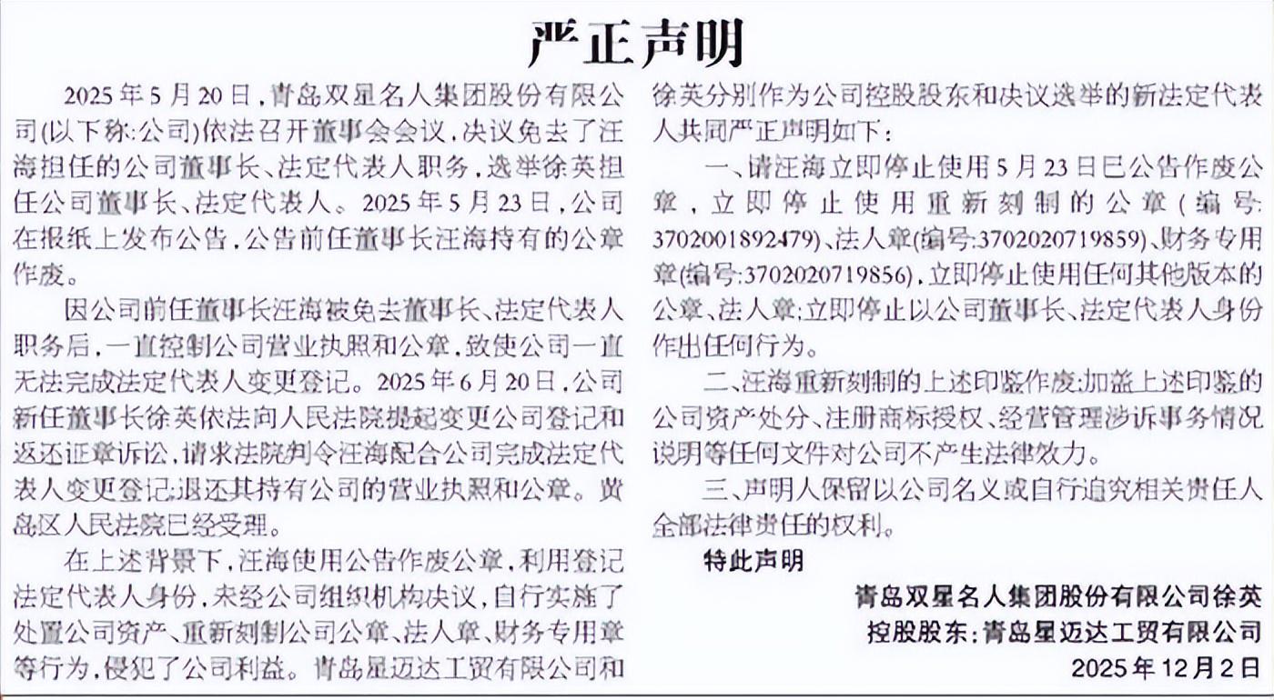 矛盾在2025年5月首次公开化,汪海当时曾发信指控儿孙“抢夺公章”、“逼宫”,并质疑公司在他不知情下被搬迁。此后双方陷入长期拉锯,直到最近一个月,从报纸版面的“公章战”升级到了如今的“断绝关系”。