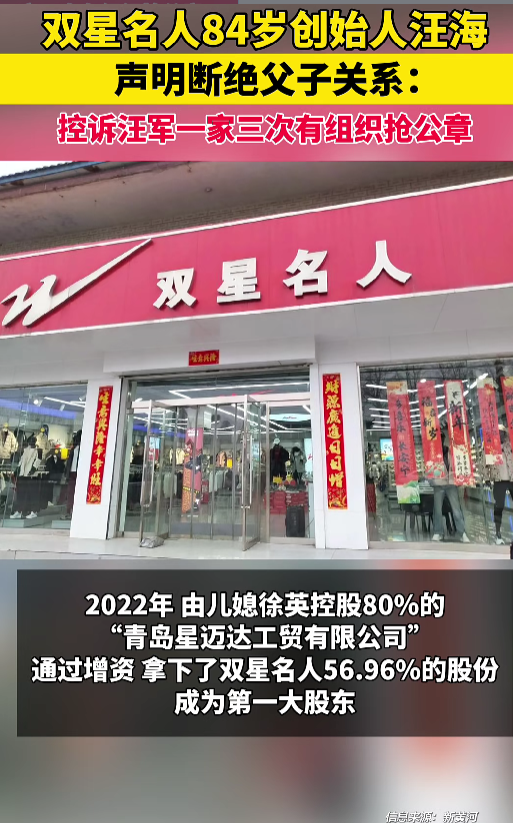 2025年12月2日,儿媳徐英率先出手。她以“双星名人董事长”和控股股东的名义发《严正声明》,直接亮明“夺权”依据:当年5月20日开了董事会,已经免了汪海的董事长和法定代表人,现在自己才是合法掌舵人。