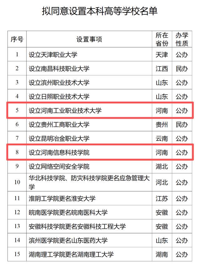 ⭐1月4日,教育部官网发布关于拟同意设置本科高等学校的公示,河南工业职业技术大学、河南信息科技学院两所院校入选。