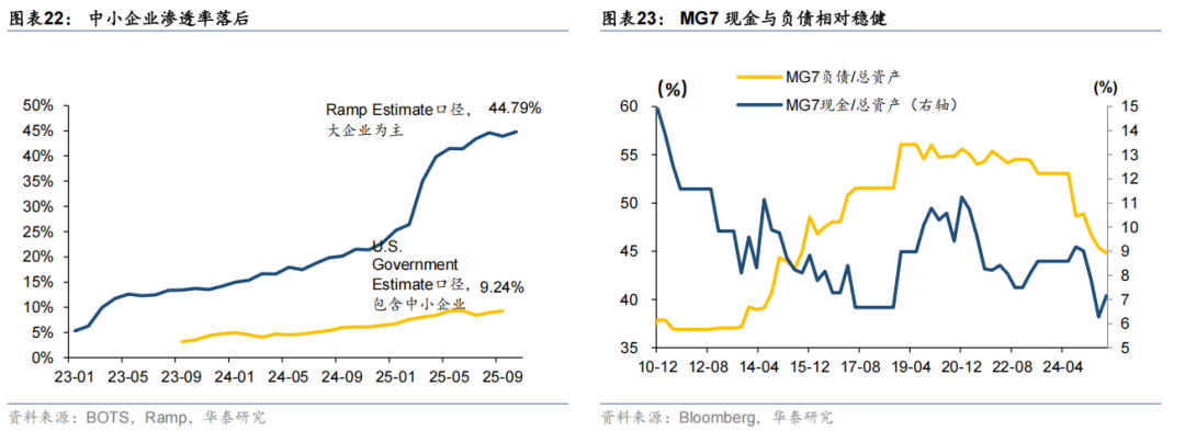 AI投资是否存在泡沫?在当前算力供不应求、Scaling law(扩展法则)依然有效的背景下,头部企业的算力“军备竞赛”已成为驱动行业投资的核心动力。据彭博测算,2025年全美AI领域投资规模有望突破5500亿美元,占GDP比重超1.3%,这一比重仍低于铁路(4.5%)、互联网(1.6%)等过往技术革命周期的峰值,整体尚不极端。此外,企业端尚未显现资金压力,头部企业现金流充裕,叠加债市、私募信贷等外部融资渠道的启动,可为企业融资扩张提供空间。因此,“投资泡沫”风险的讨论尚且较早,相关判断需待产能基本落地、中下游发展路线明确后再作定论。