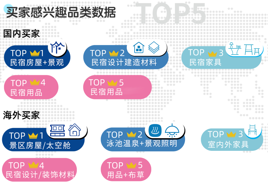⭐️海外买家的偏好则为:景区房屋、太空舱、泳池温泉、景观照明、室内外家具、民宿设计/装饰材料、用品/布草等文旅住宿硬核装备全配齐!这波需求直接拉满,特色商机就等你来!