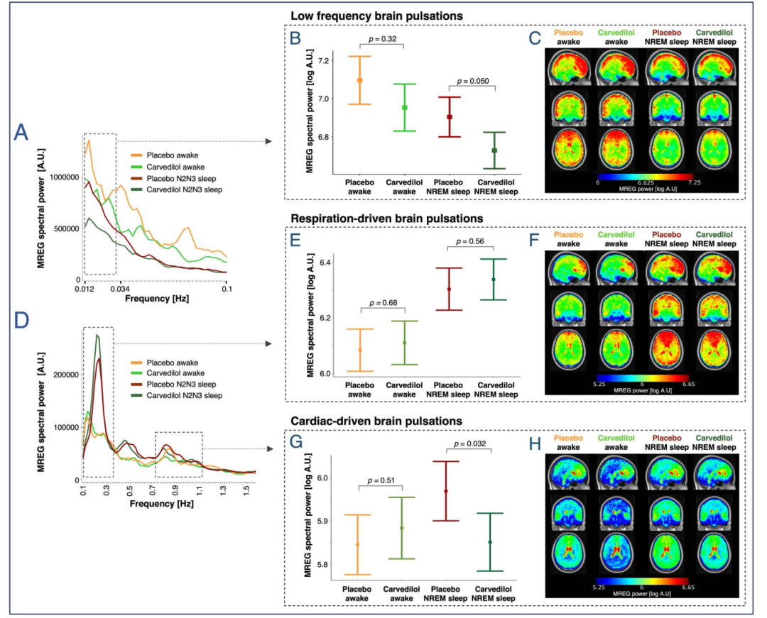 最后,作者通过对比安慰剂与 α1/β 肾上腺素能拮抗剂卡维地洛干预后的数据,明确了肾上腺素能通路对不同类型脑搏动的调控作用:卡维地洛显著降低血浆去甲肾上腺素水平,但未改变受试者的呼吸频率、心率及睡眠结构(包括清醒与 NREM 睡眠的时间占比)。