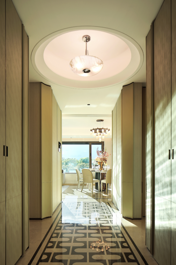 - 一梯一户与归家礼仪:通过错位设计实现实质的一梯一户,电梯厅成为私享空间。入户玄关采用奢石与水刀拼花工艺,营造出强烈的归家仪式感和尊贵体验。