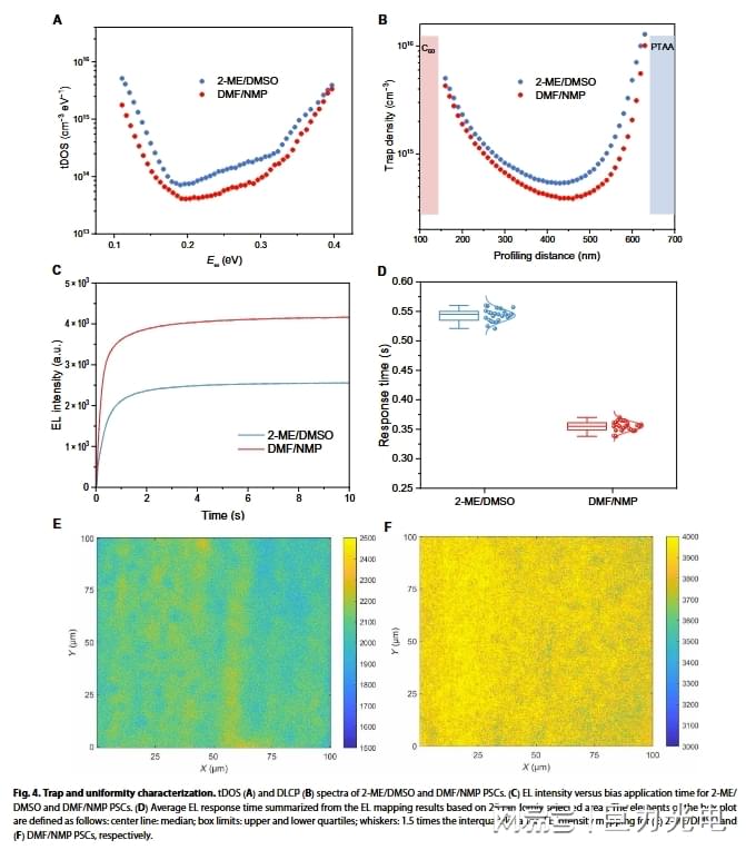 研究团队通过系统探究铯/甲脒基钙钛矿前驱体墨水的本征稳定性,证实溶剂配位-分散平衡是决定墨水稳定性的核心因素。基于此,团队筛选具有不同配位强度与溶解特性的溶剂,开发出基于二甲基甲酰胺/氮甲基吡咯烷酮(DMF/NMP)的长寿命稳定型前驱体墨水。该墨水可有效调控成膜干燥与晶体生长过程,刮涂制备的钙钛矿薄膜兼具优异的均匀性与低缺陷态密度。