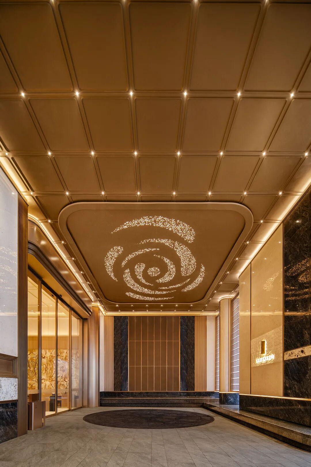 再进一步了解,就会发现,大量的暗金色铝板艺术,如星空顶、重檐造型、灯光壁龛、观景阁等更是随处可见。尤其是风雨连廊三重铝板造型,中间“双层灯带”设计,更为暗金色加上了“美颜光”,为环境加上了一抹滤镜。