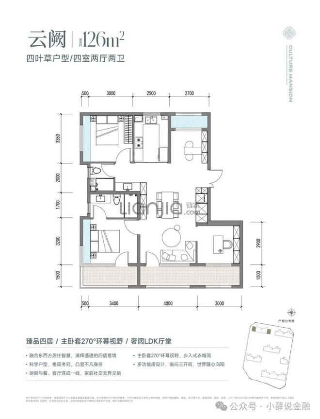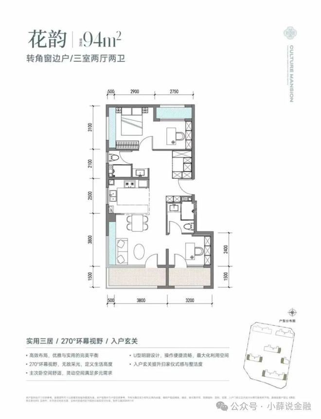 花语璟云匠心设计了94-126平方米的三居和四居户型。94平方米的三居将功能与美学无缝缝合;110平方米的户型配有270度转角窗,将室外景致框成流动的诗画。