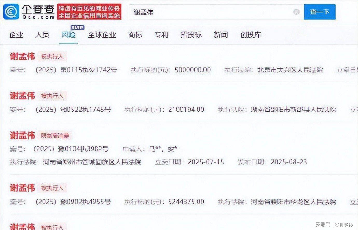 全平台账号封禁后,谢孟伟因为四个案件纠纷,被执行超过1400万,被列入失信人员名单。