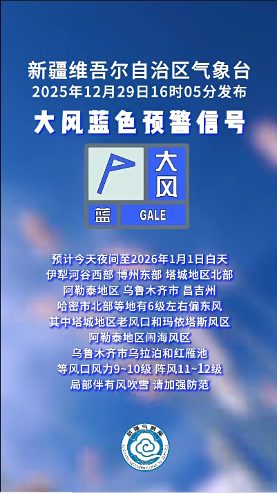31日夜间到2026年1月1日白天,阿克苏地区西部山区域、克州山区、喀什地区南部山区、和田地区南部山区、巴州南部山区、哈密市山区等地的局部区域有小雪,局地中雪;北疆大部有5级左右偏东风,其中塔城地区老风口和玛依塔斯风区、阿勒泰地区闹海风区、乌鲁木齐市乌拉泊和红雁池等风口风力8~9级,局地伴有风吹雪。全疆其它地区以晴或多云天气为主,风力不大。
