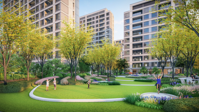 以公园+花园的双园社区、品质归家入口、特色阳光草坪、双会客系统、主题儿童乐园、健身系统这六大功能价值为主,并且融合由三条不同主题的林荫步道和三个圆形景观节点组成的“绿林项链”全区漫步系统,共同构成全区“6+1”森O₂家园系统。