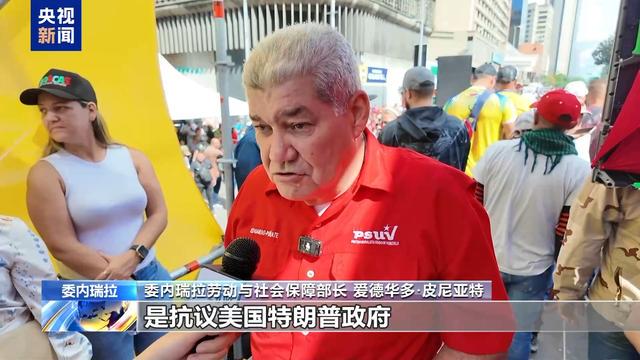 委内瑞拉劳动与社会保障部长 爱德华多·皮尼亚特:我们在这里,加拉加斯的人民走上街头举行抗议活动,是抗议美国特朗普政府对委内瑞拉人民发动的侵略行径,包括对委内瑞拉实施轰炸,以及对委内瑞拉总统马杜罗和其夫人的绑架行为。这是一次赤裸裸的侵略、一次犯罪性的侵略。我们今天站在这里,要求其立即释放马杜罗总统和其夫人。我们也郑重表明,为了捍卫委内瑞拉的国家主权和独立,我们愿意付出一切努力。